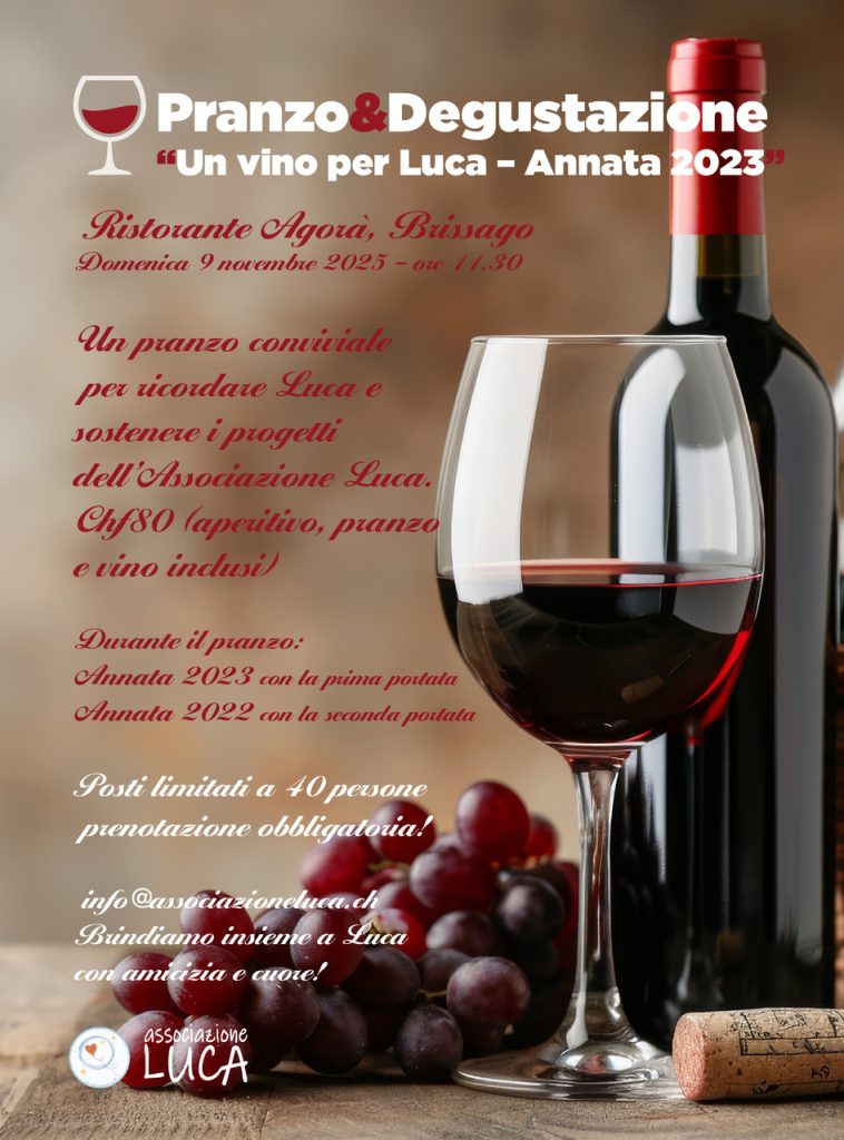 Domenica 9 novembre si è svolto il primo pranzo di beneficenza organizzato dall’Associazione Luca, accompagnato dalla degustazione del vino “Un Vino per Luca – Annata 2023”, prodotto grazie al lavoro dell’Associazione, di numerosi volontari e con il prezioso supporto di Andrea Arnaboldi della Cantina Chiodi. Il vino viene venduto interamente a scopo benefico. Un ringraziamento sincero va anche al Signor Milani, che ha messo gratuitamente a disposizione il vigneto di Cavigliano.
