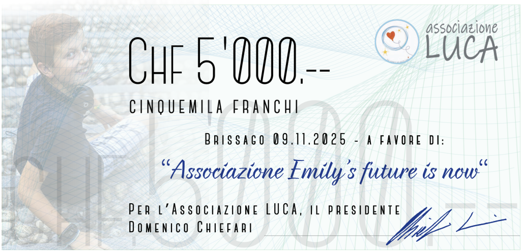 La partecipazione è stata numerosa e l’atmosfera di vicinanza e sostegno che si è creata ha dato grande valore alla giornata. Durante l’evento, alla presenza del Comitato, di Emily con il fratellino Ethan, della mamma e del papà, nonché del Presidente dell’Associazione Emily’s Future is Now (emilysfuture.ch), abbiamo devoluto un contributo a favore della ricerca sulla rara patologia genetica LAMA2.